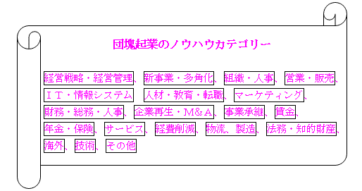 | 平州知恵の輪で対象とするビジネスノウハウは、団塊世代のノウハウを主としていますが、ビジネスパーソン・中小企業同族経営者のノウハウも対象としています。 |